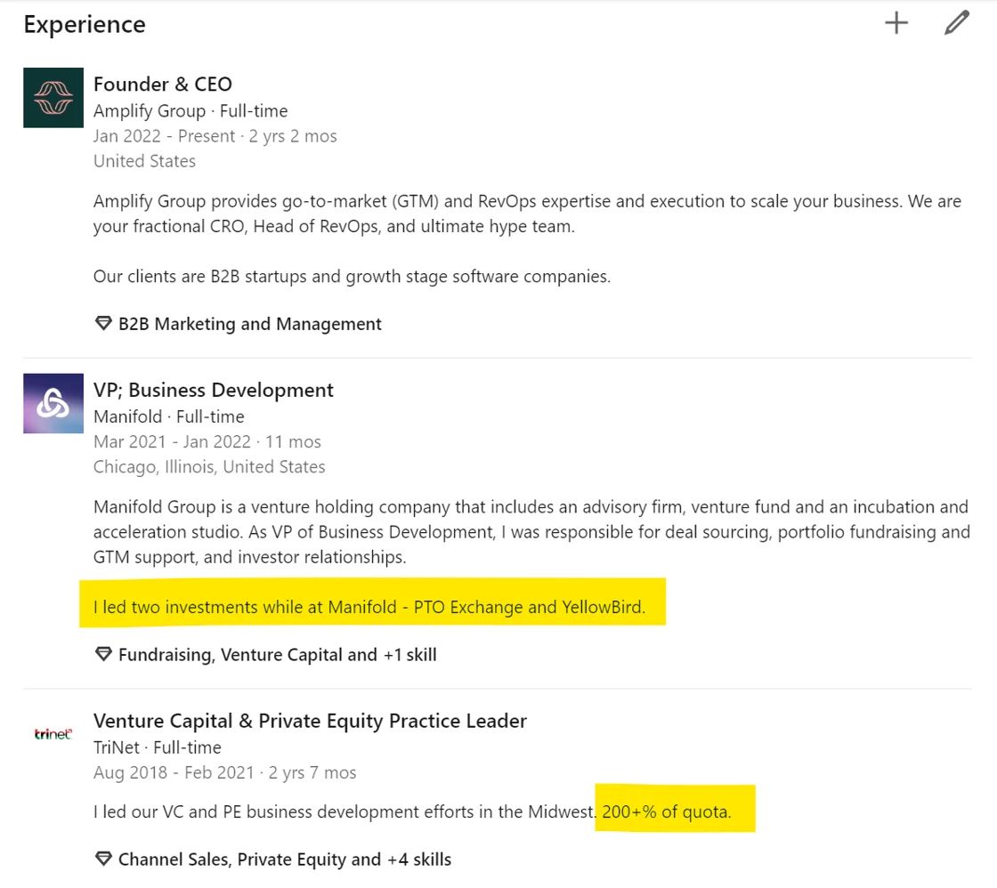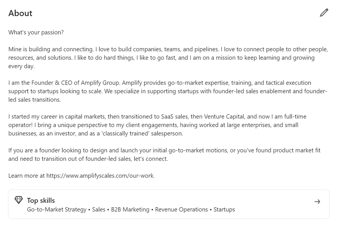 Again, a tagline that says 'Founder of Amplify' is boring and tells most people who don't me, nothing at all. Amplify is a 2 year old company most people don't know, I don't work at Amazon. Get creative and continue to draw people in with this section.