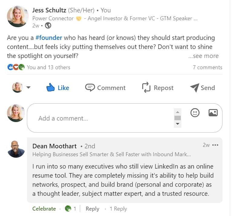 Now, to be clear...a comment like "Great post, very insightful' or 'Agreed, thanks Joe'.....boringgggg and zero value add. There is a time and place for these simple and short comments so I am not saying never do it, but they won't help you with the task at hand we're discussing.