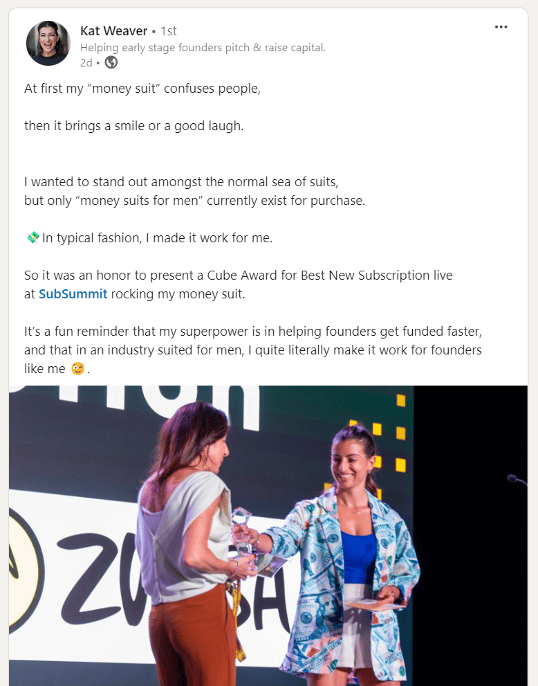 If it’s a more buttoned-up event, you can still stand out with a fun tie, a bow tie, a cool piece of jewelry, or a unique blazer (like my friend Kat). Get creative.