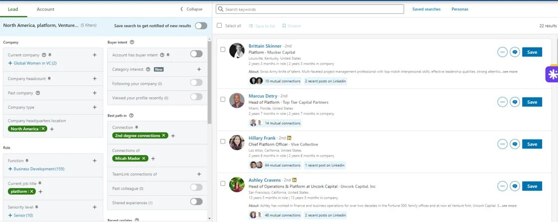 "Connections of" - easily filter your closest investors/partners/peers connections to identify warm intros (Example here using my friend Micah - there are 22 people with a platform title in VC that I could ask for an intro to). It is SO much easier to get warm intros if you can get super specific about WHO (name) you are looking to connect with.
